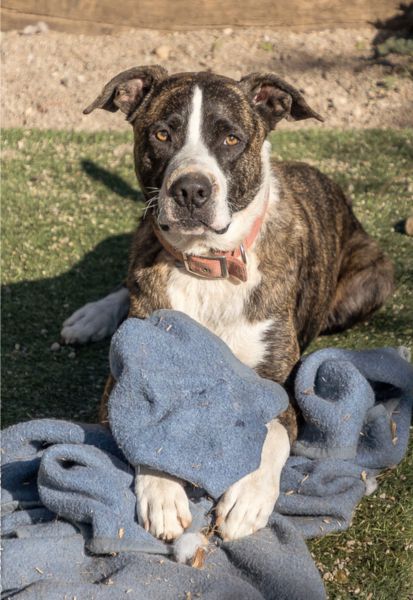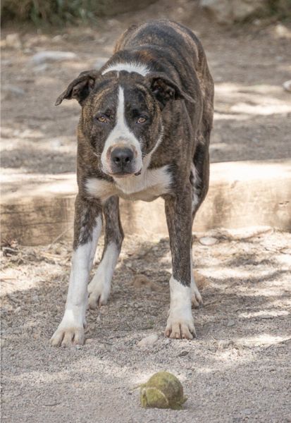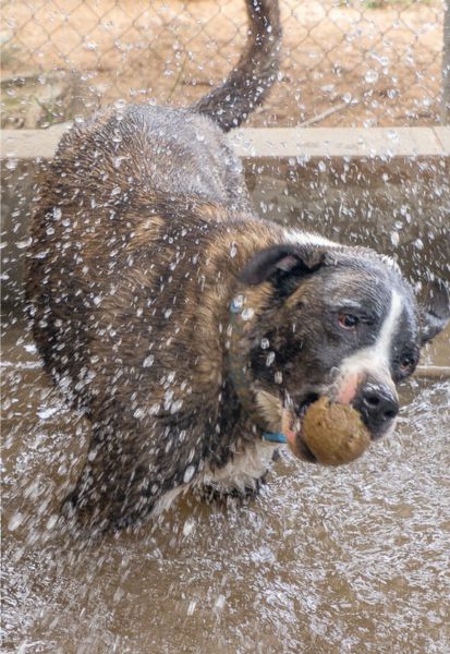 Es un perro muy simpático y activo. Siempre está dispuesto a jugar y a que le lancen la pelota, es su gran pasión. También le encanta el agua, y siempre que tiene ocasión se da un chapuzón. Jugando en el refugio se fracturó una pata y estuvo en una casa de acogida para recuperarse de la operación: allí convivió con niños y otro gato perfectamente. Se relaciona muy bien con toda la manada.
